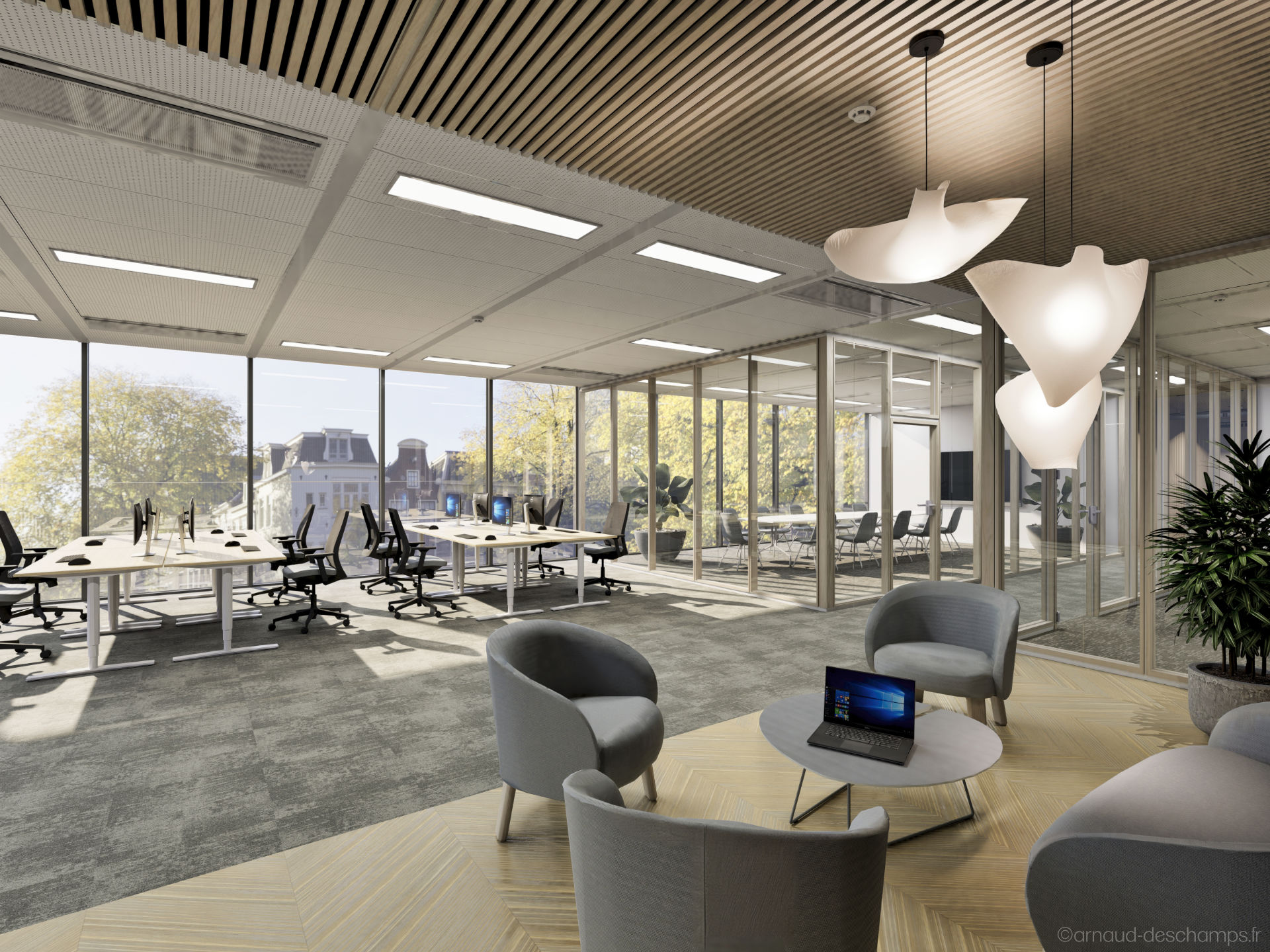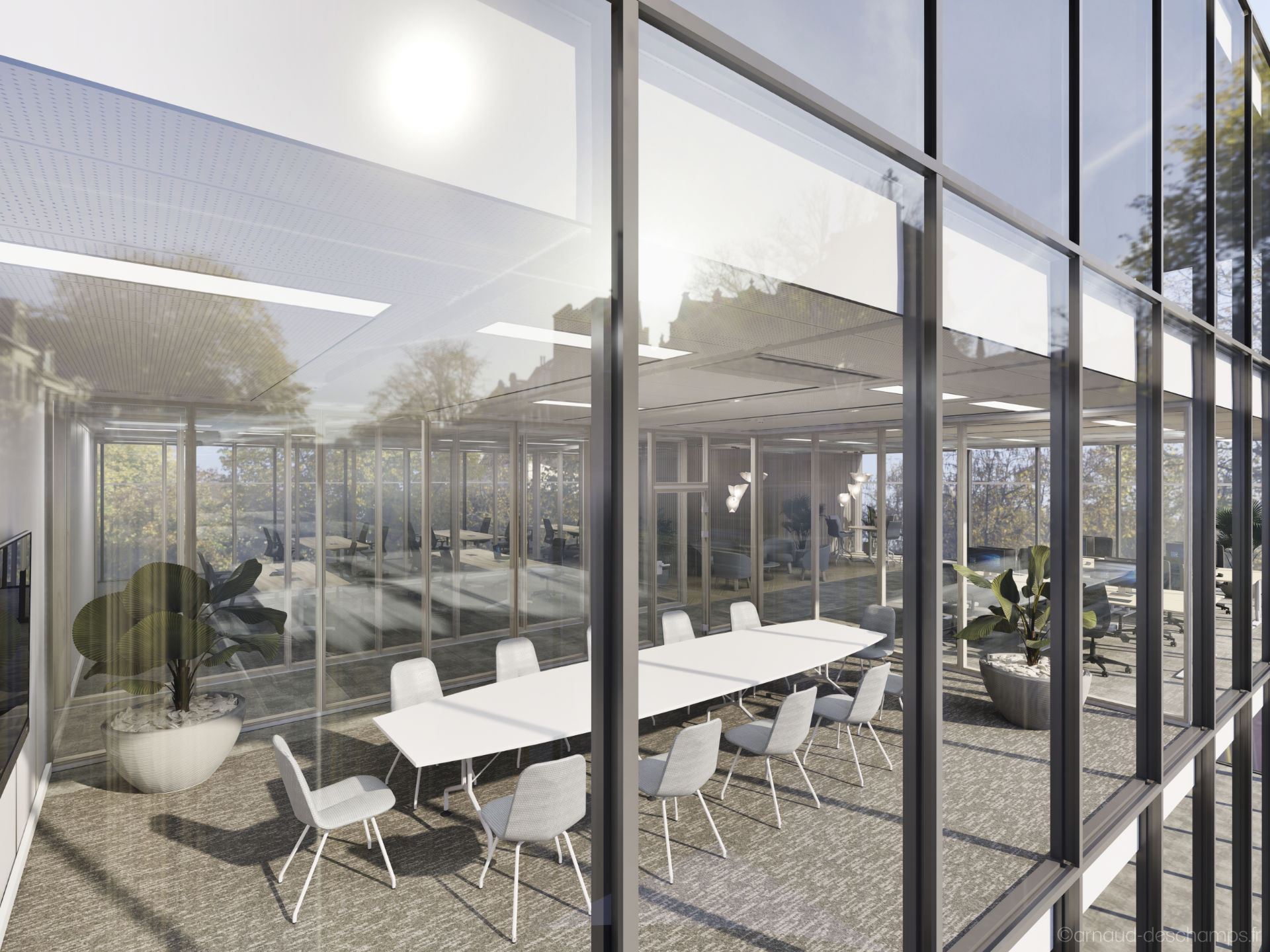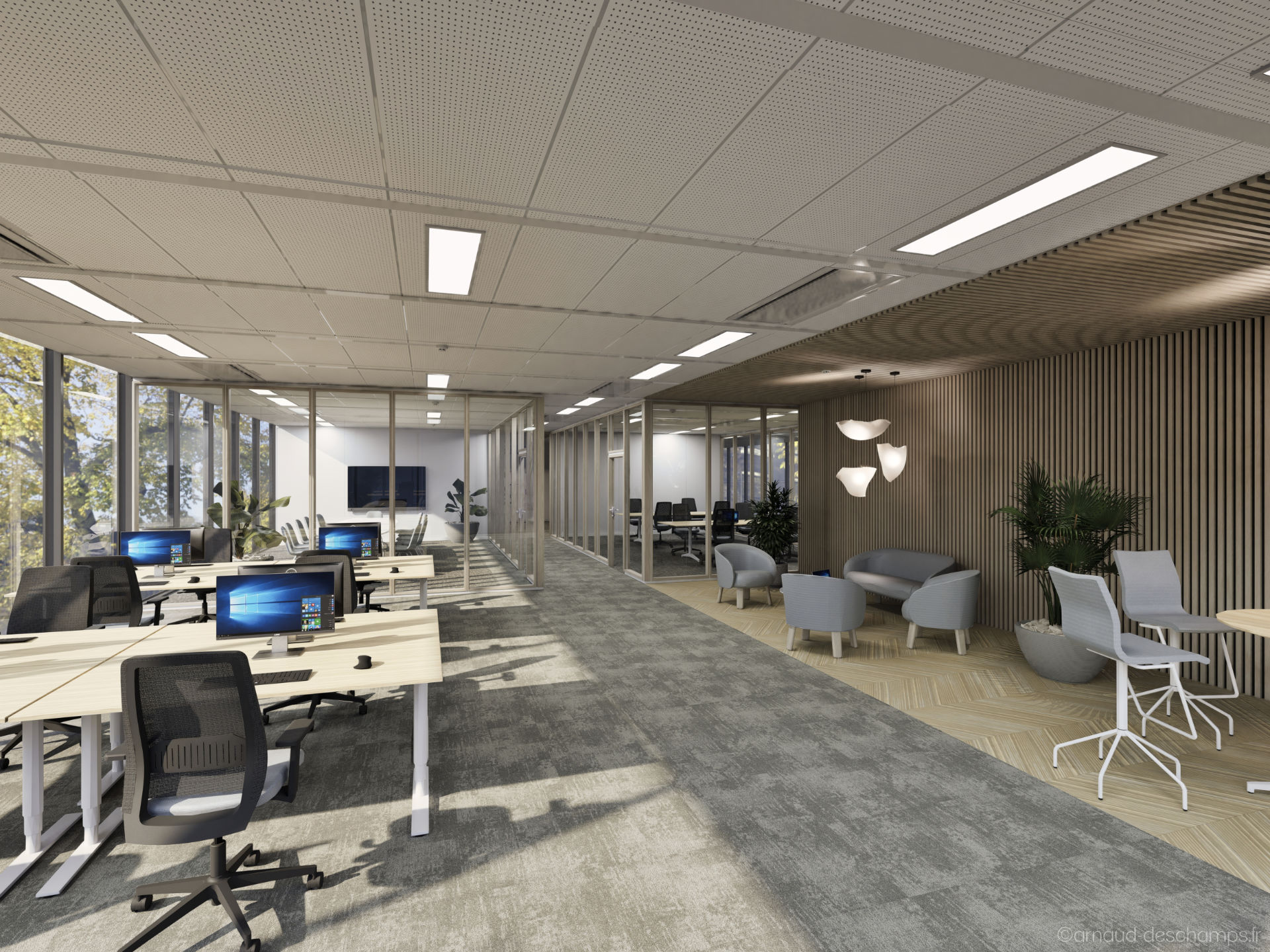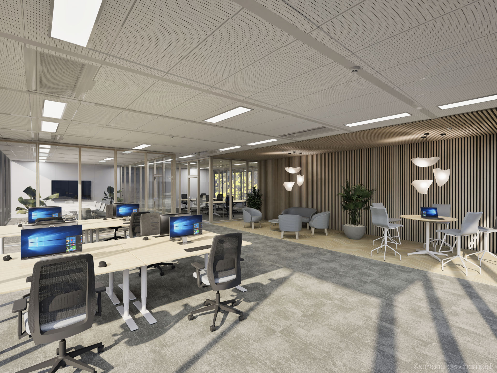 Le réalisme des perspectives 3D permet de se projeter rapidement dans les usages : bureaux fermés ou en open-space, zones de convivialité, éclairages naturels, végétalisation, mobilier professionnel…