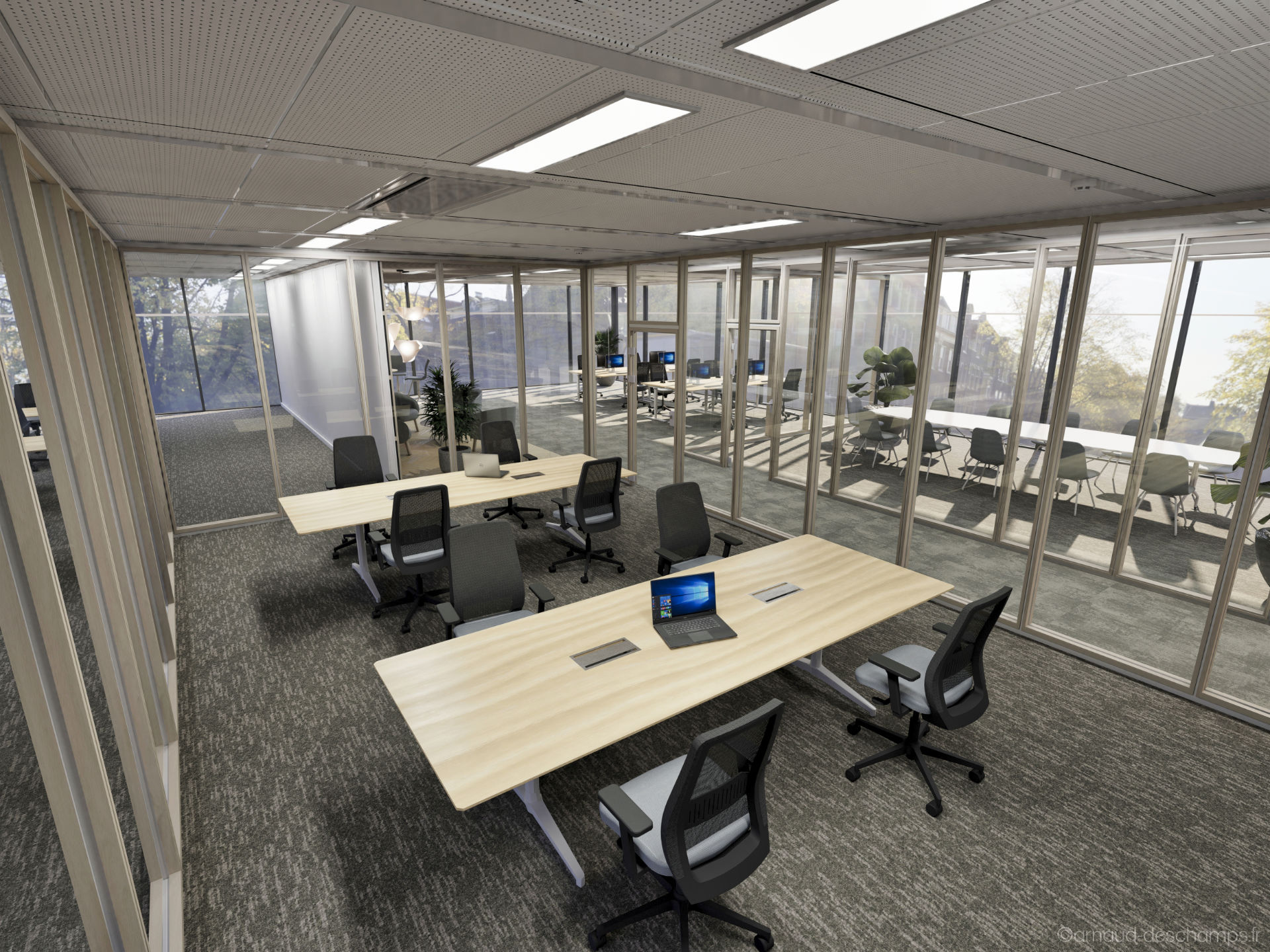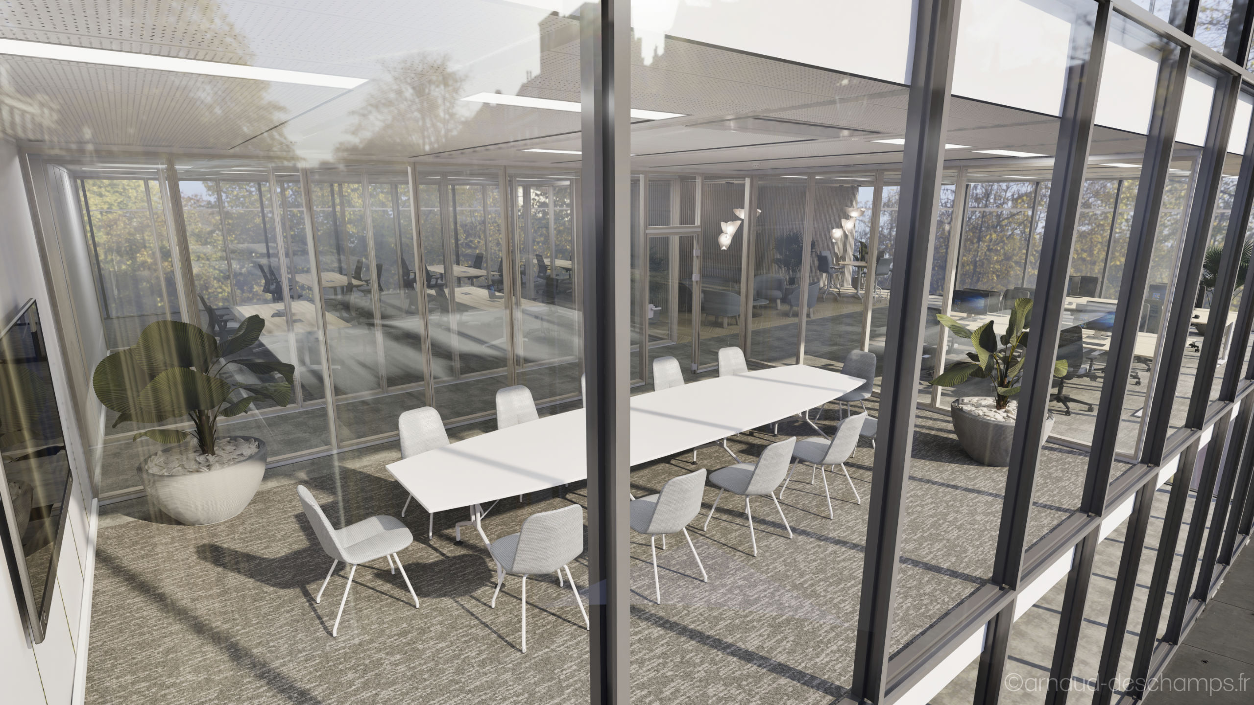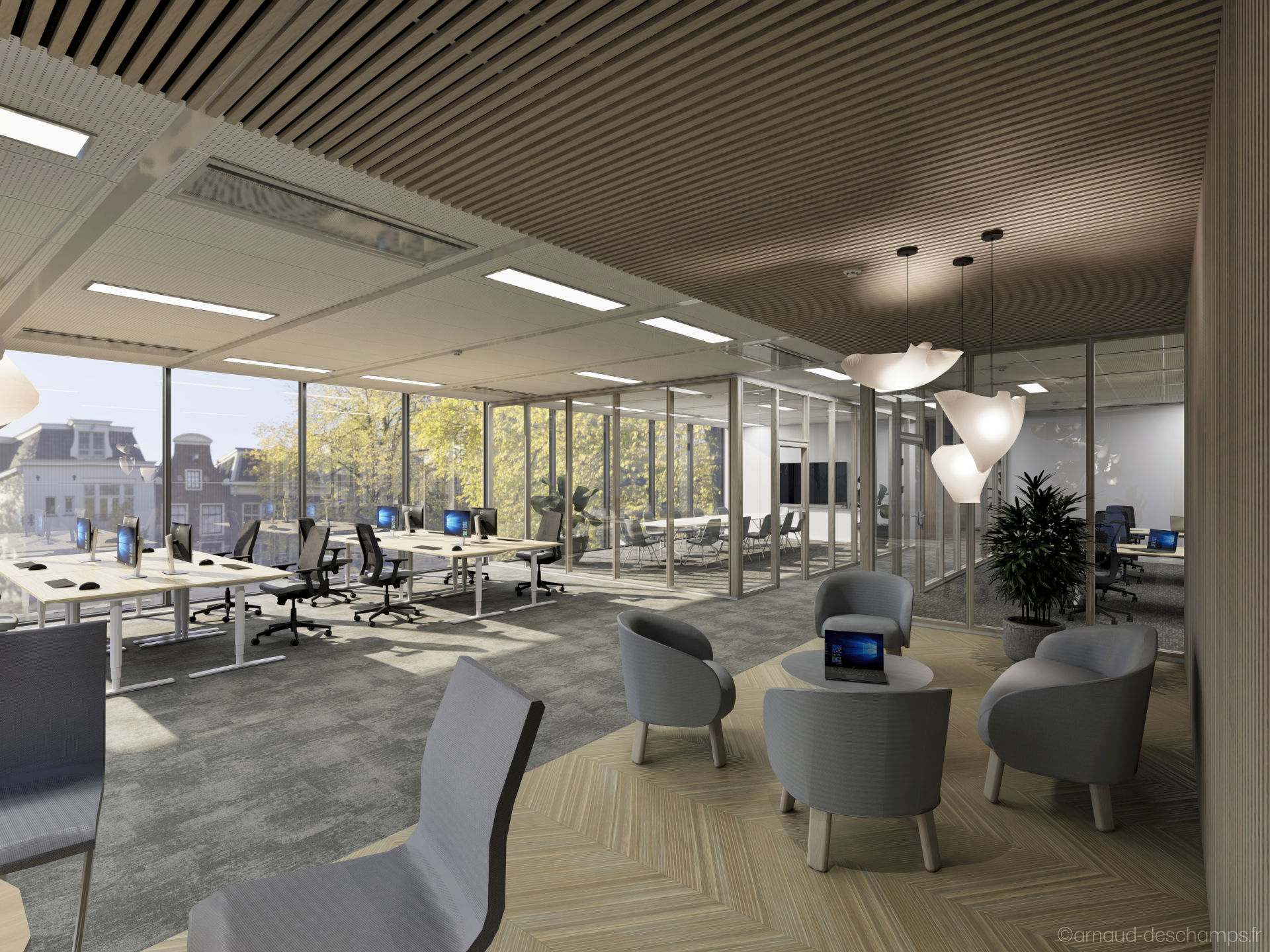 Le réalisme des perspectives 3D permet de se projeter rapidement dans les usages : bureaux fermés ou en open-space, zones de convivialité, éclairages naturels, végétalisation, mobilier professionnel…