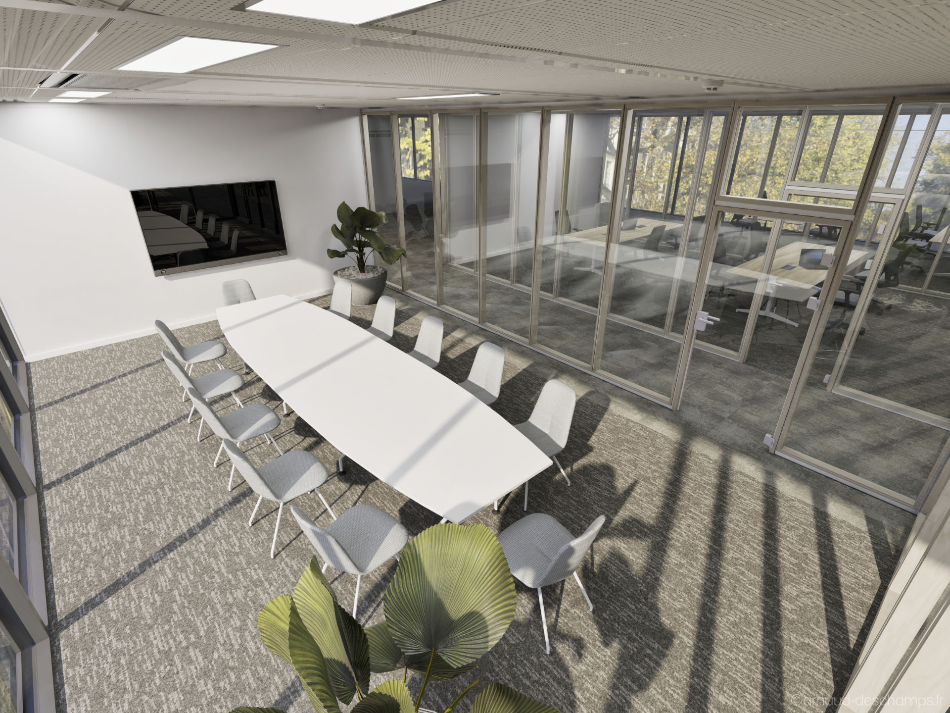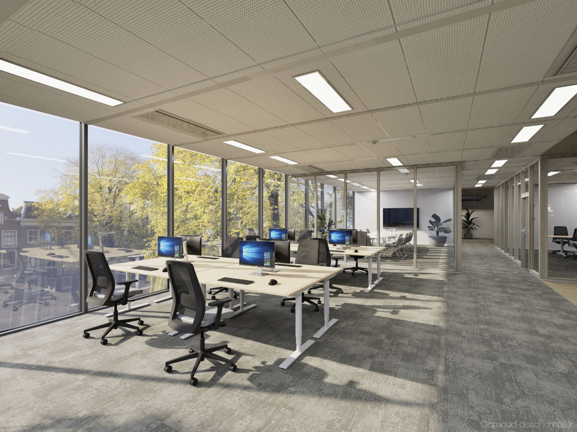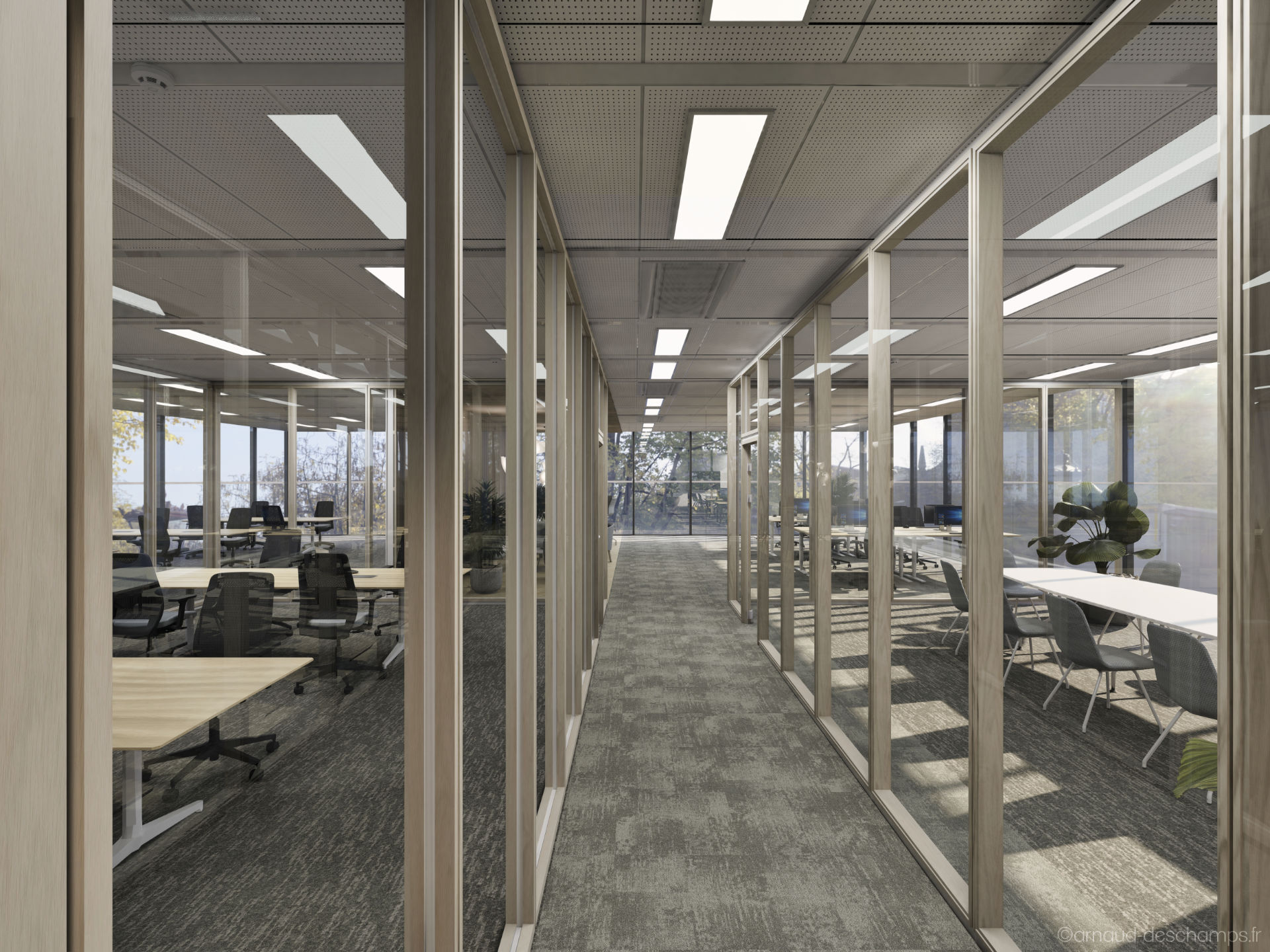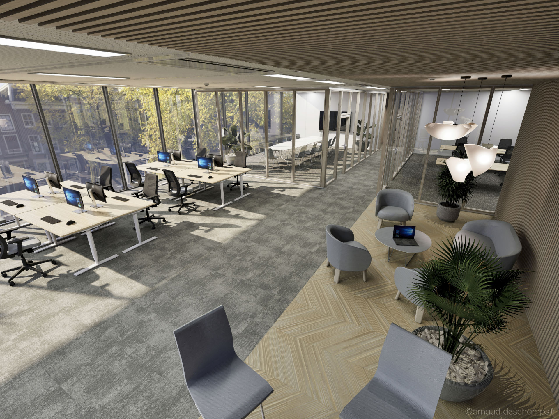 Le réalisme des perspectives 3D permet de se projeter rapidement dans les usages : bureaux fermés ou en open-space, zones de convivialité, éclairages naturels, végétalisation, mobilier professionnel…